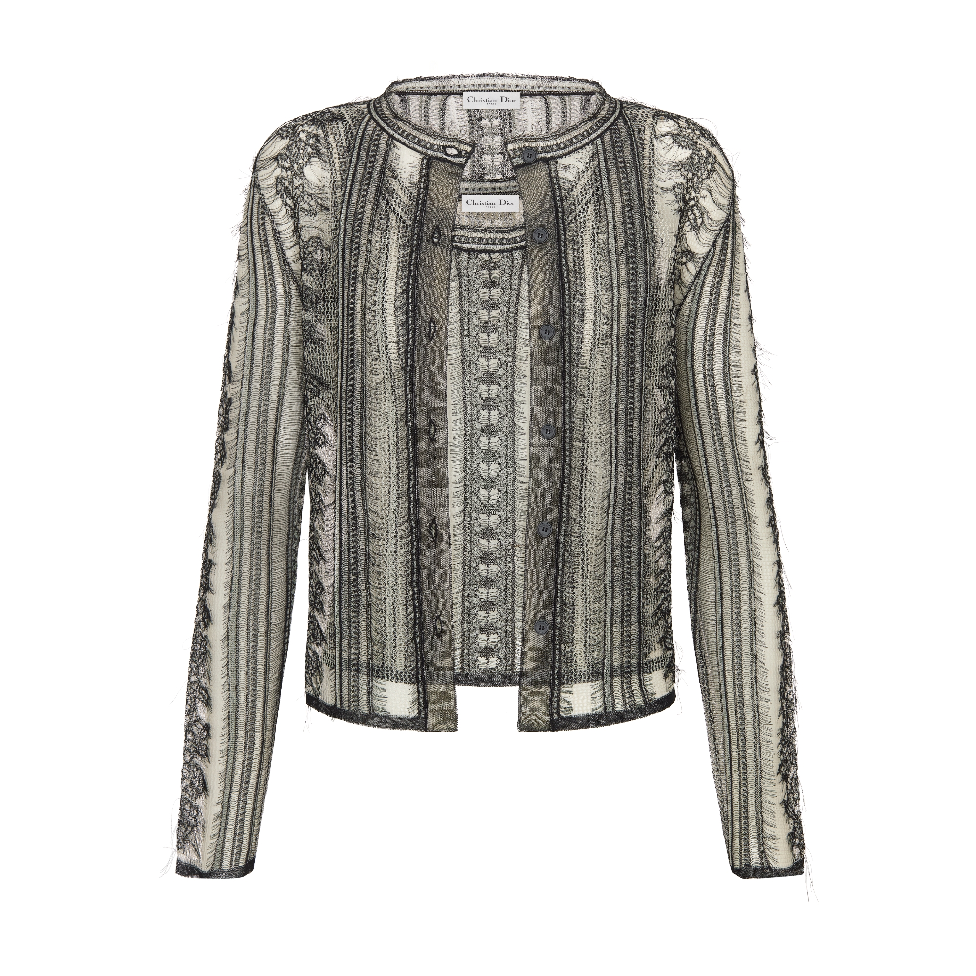 The twinset displays the Lumière de Rose motif, featuring Mr. Dior's cherished roses, delicately interlaced with cornflowers in an embodiment of love and timeless beauty. Crafted in a beige fringed silk knit, it is composed of a round neck tank top and cardigan. The twinset will pair with other Lumière de Rose creations to define a refined, sophisticated look. Front button closure. Christian Dior Paris mother-of-pearl buttons. Unlined. 100% silk (14 gauge)*. Made in Italy. Treat with extra care and gently dry clean