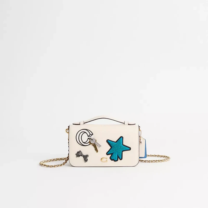 Pre-owned and now (re)loved, this Bea Crossbody Bag is a very special Coach upcrafted design inspired by our commitment to rethinking and reducing our impact on the planet. Saved from the landfill, this gently-worn bag was lovingly repaired and transformed by our in-house craftspeople who added clever details to give it a second life. It’s completely one-of-a-kind, and comes with its own unique set of charms. Wear it, love it, pass it on.Reimagined by Eunice Chang with a bold pop of blue and whimsical embellishments for a fun Varsity vibe, this foldover style has been expertly cleaned, conditioned and restored. Our talented craftsperson Nicole Izquierdo hand-decorated the front with vibrant patches and pins, then added a playful repurposed charm. A slender design, Bea is crafted of refined leather detailed with our Signature hardware. Featuring organized compartments and multifunction pockets with space to hold all the essentials, it’s a convenient convertible style that can be worn four ways: carried as a clutch, held by the top handle, slung on the shoulder or crossbody with the sophisticated leather inlay chain strap.