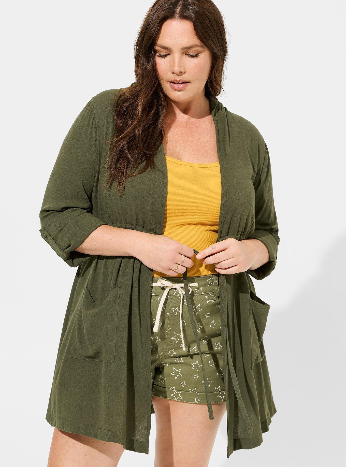 FIT Measures 38'' from shoulder (size 2). MATERIALS + CARE Washable Gauze woven fabric: The lightweight, breathably soft fabric you love is, at last, wash, wear and go! Stretch level: None. 74% rayon, 26% polyester. Machine wash cold. Tumble dry low. Imported. DETAILS Hooded neckline. 3/4 snap-closure sleeves. Drawstring waist. 2 front pockets.