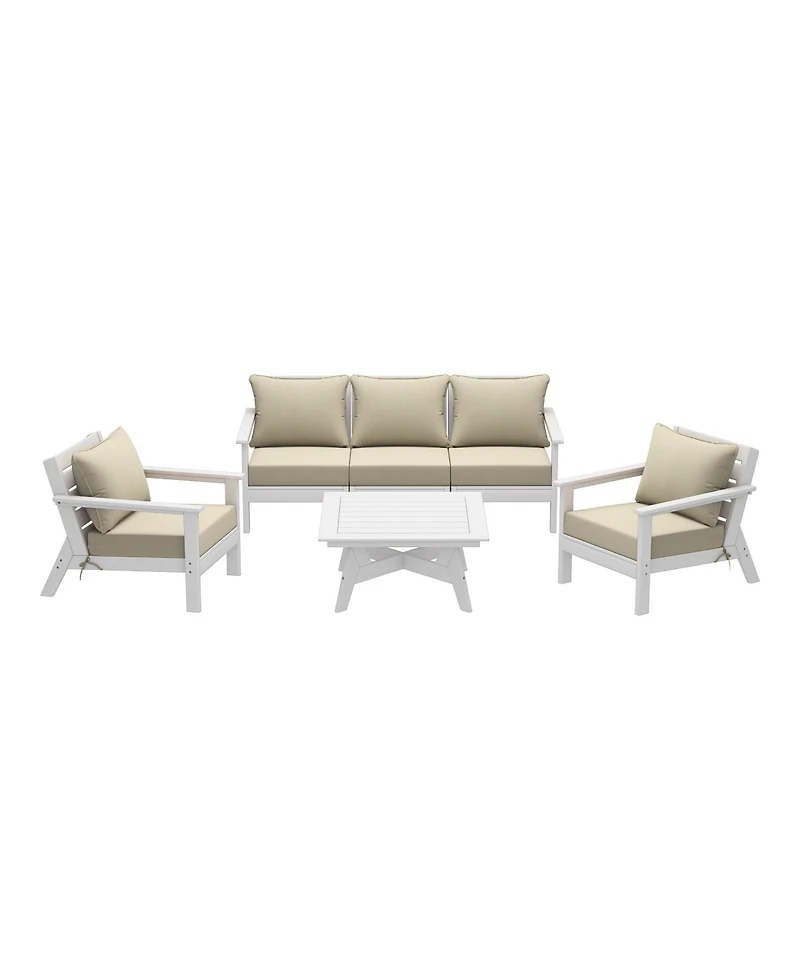 Invite friends and family over this season and gather around our charming 4 seating 5-piece outdoor patio furniture sectional set. Sink into comfort on the high-resilience foam-filled, water-repellent deep seating patio cushions, far superior to regular polyurethane foam. Crafted from durable Hdpe material, this sectional is more resilient than metal or wood options, with fade-resistant and weather-resistant properties. Create a cozy and inviting outdoor space with this stylish and durable furniture set.