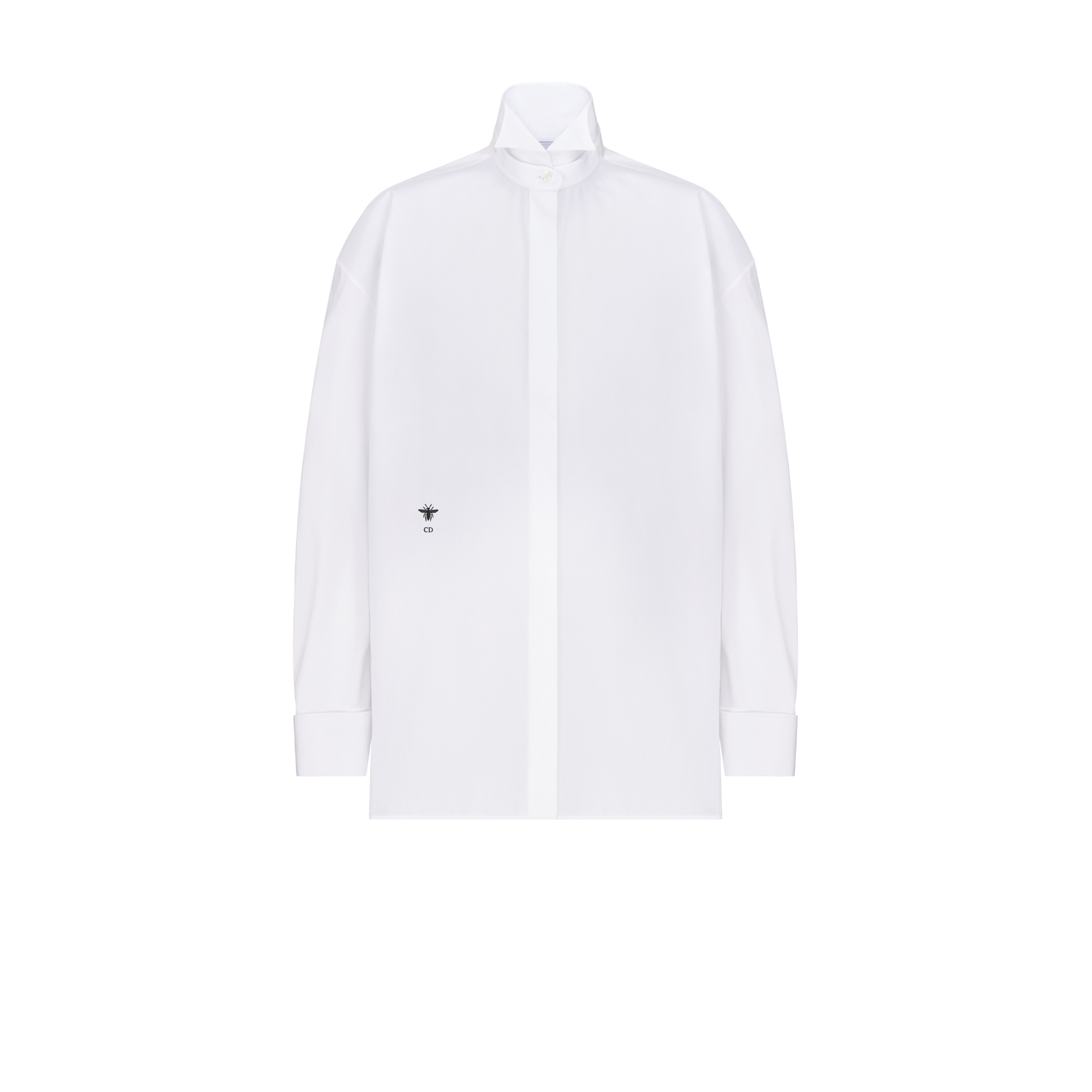 Unveiled at the Autumn-Winter 2025-2026 Fashion Show, the blouse showcases an essential Dior silhouette revisited with the collection's opulent aesthetic. Crafted in white cotton poplin, it has an oversized cut enhanced by removable buttoned cuffs as well as a refined, tuxedo-inspired wing collar. Revealing a tonal, structured bustier embellished with zip closures, the blouse can be styled with pants from the collection for a couture look. Embroidered hallmark bee. Front button closure. Removable buttoned cuffs. Mother-of-pearl buttons. Integrated bustier with zip closures. Unlined. 100% cotton. Made in Italy