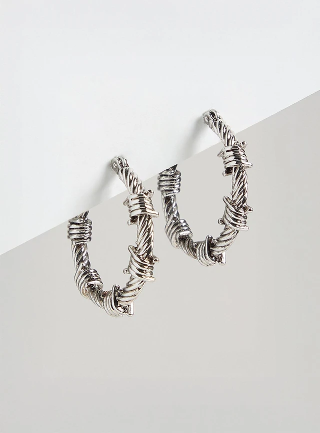 Fantas Eyes Barbed Wire, Chain & Flame Silver 3 Pack Hoop Earrings