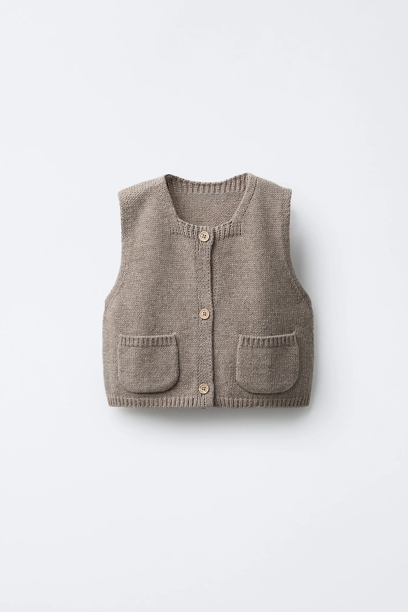 Knit vest with square neck and sleeveless design. Front button closure. Patch pockets on the front. Fabric with 20% wool.