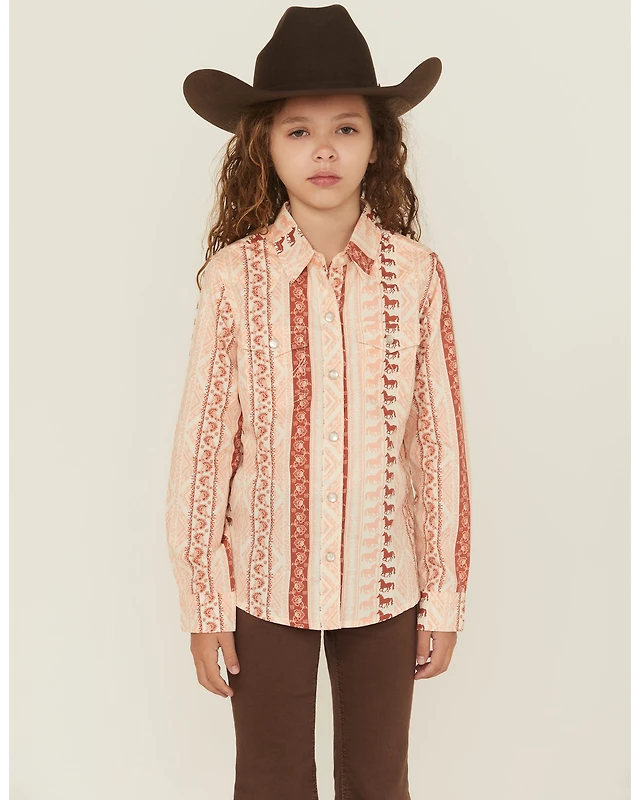 Wrangler Girls' Horse Striped Print Long Sleeve Snap Western Shirt