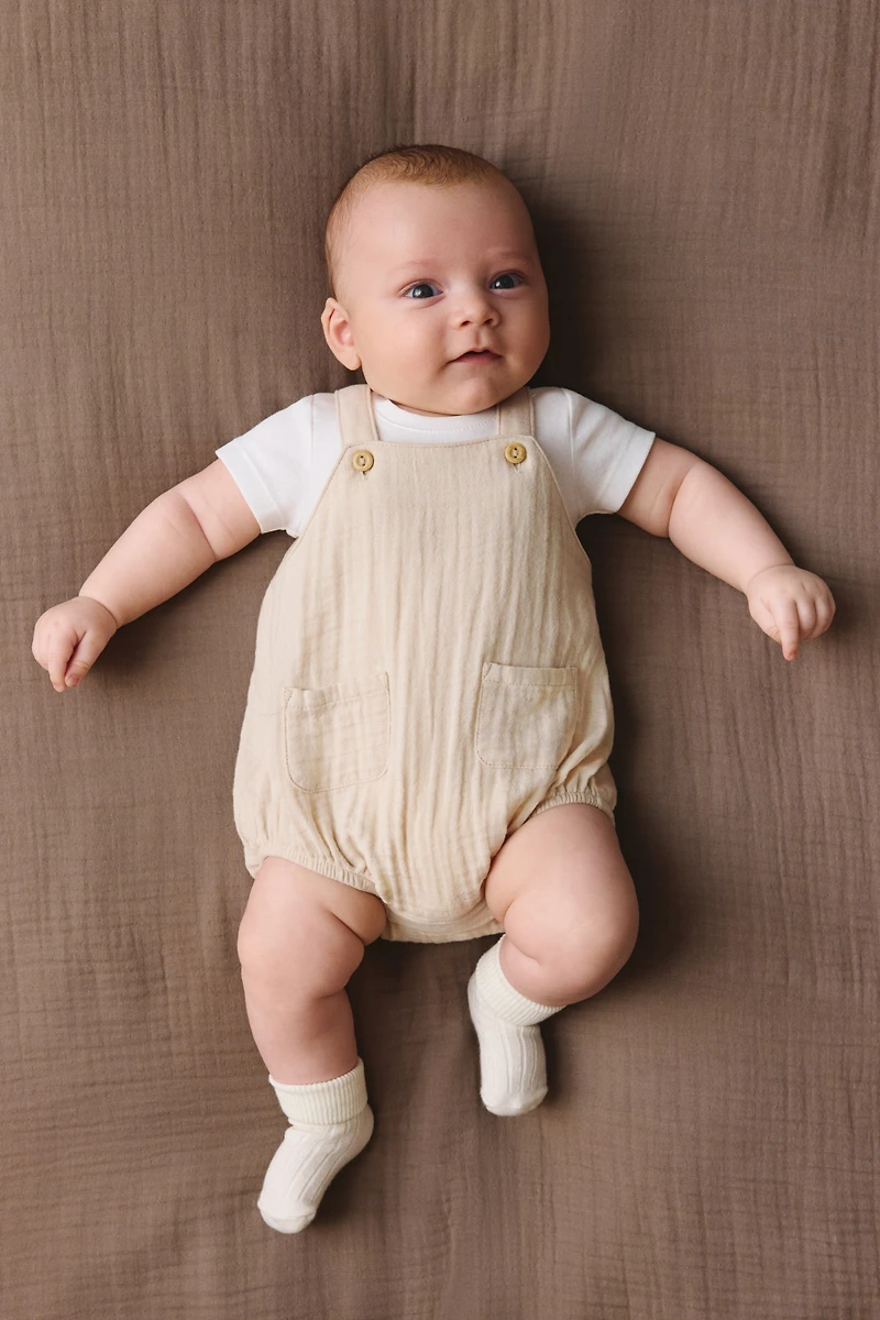 Set with a bodysuit in supersoft cotton jersey and romper suit in soft, woven cotton fabric. Bodysuit with a round neckline, snap fasteners on shoulders, short sleeves, and snap fasteners at gusset. Romper suit with adjustable straps with faux wood buttons at front, concealed snap fasteners at gusset for easy changing, and elasticized leg openings.