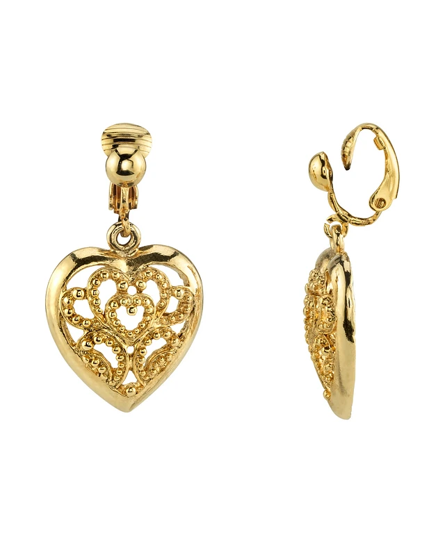 2028 Gold Tone Filigree Heart Drop Clip Earrings