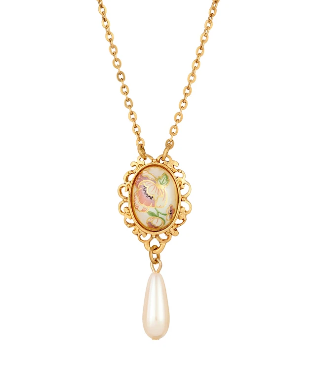 2028 Women's Gold Tone Ivory Porcelain Rose Oval Pendant with Imitation Pearl Drop Necklace