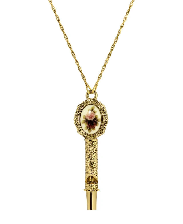 2028 Gold Tone Pink Flower Decal Whistle Necklace