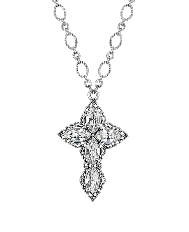 2028 Silver Tone Large Crystal Cross Pendant Necklace 28"