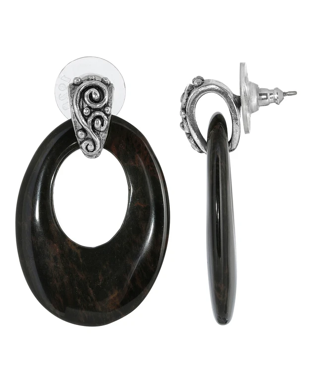 2028 Pewter Semi Precious Oval Obsidian Hoop Earrings
