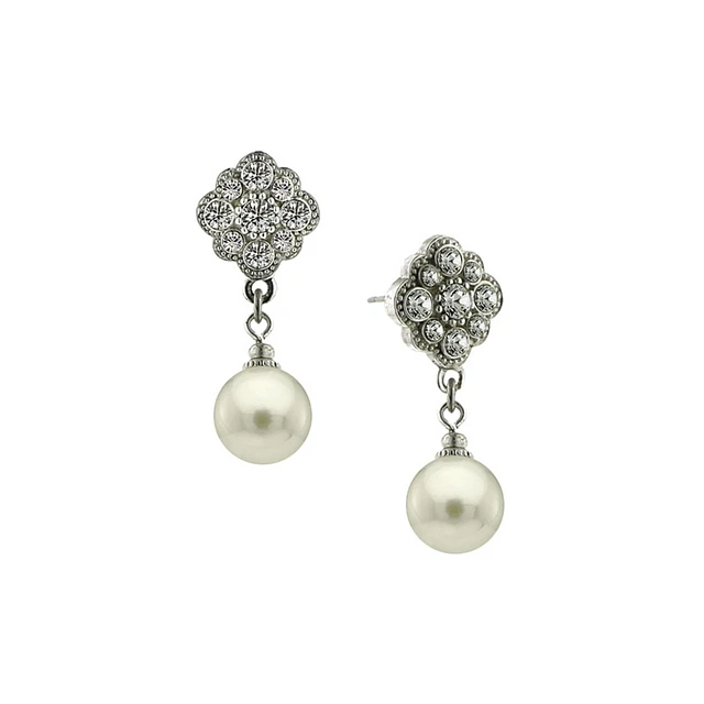 2028 Silver-Tone Crystal and Simulated Pearl Round Drop Earrings
