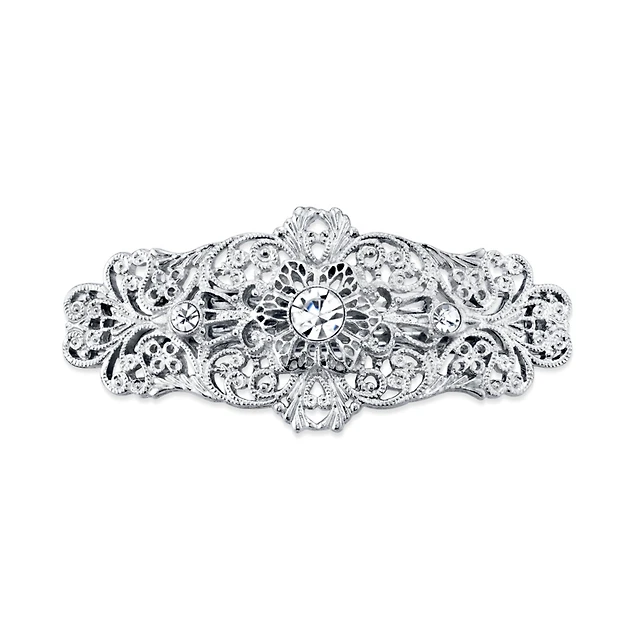 2028 Silver-Tone Crystal Filigree Bar Barrette