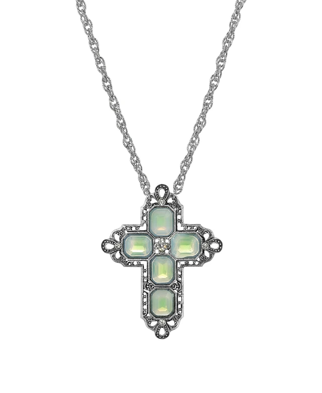 2028 Pewter Fan Light Green Crystal Cross 16" Adjustable Necklace