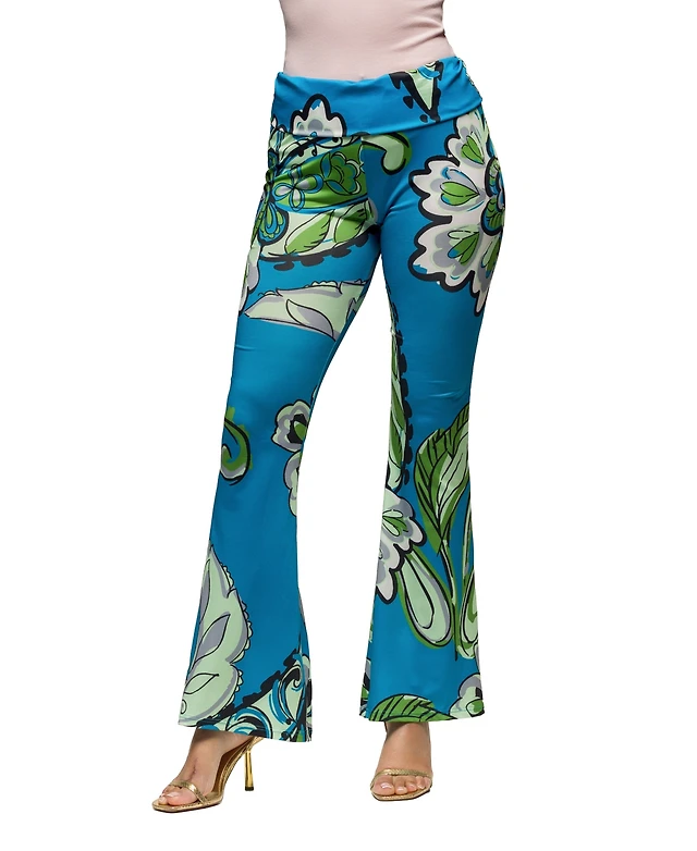 24seven Comfort Apparel Women's Teal Paisley Print Bell Bottom Foldover Waist Pants