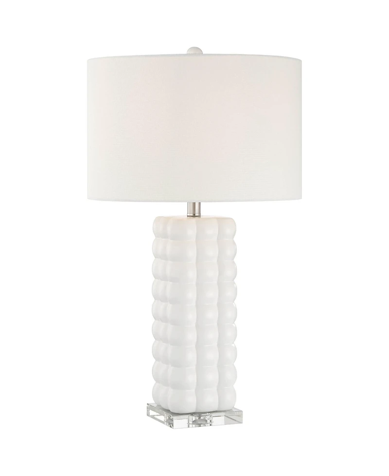 Bring light and lively texture to your space with the Norma table lamp from 360 Lighting. Standing 28" high, this lamp features a ceramic base finished in a clean white tone that brightens any room. Its surface is adorned with a series of raised bubble-like forms, creating a dimensional, sculptural look that s both playful and sophisticated. Up top is a white linen fabric drum shade for a touch of luxury. A clear crystal glass square accent at the very bottom brings added sparkle. This lamp comes with a tabletop dimmer, which allows you to control the level of lighting. Simply insert the lamp plug into the dimmer outlet, and then slide the switch on the control to dim or brighten the lighting. Dimmer is compatible with halogen and incandescent bulbs, and most dimmable Cfl and Led bulb designs.