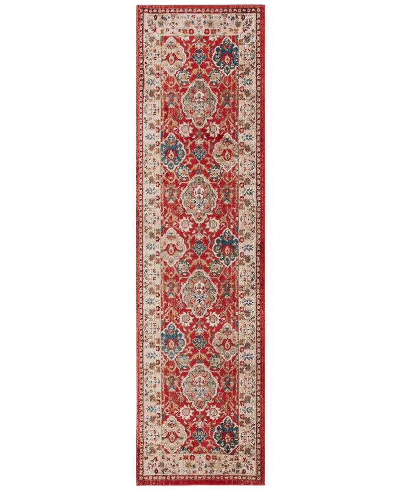 Offers affable appeal with lovely floral motifs bordered by a fine frame of leafy vines and fronds. Stately red hues create a regal backdrop for the beige and blue motifs and ornately detailed border. Power-loomed using supple polypropylene yarns for a soft, wool-like feel underfoot. True end fringes add an exquisite finishing element to Ariel.