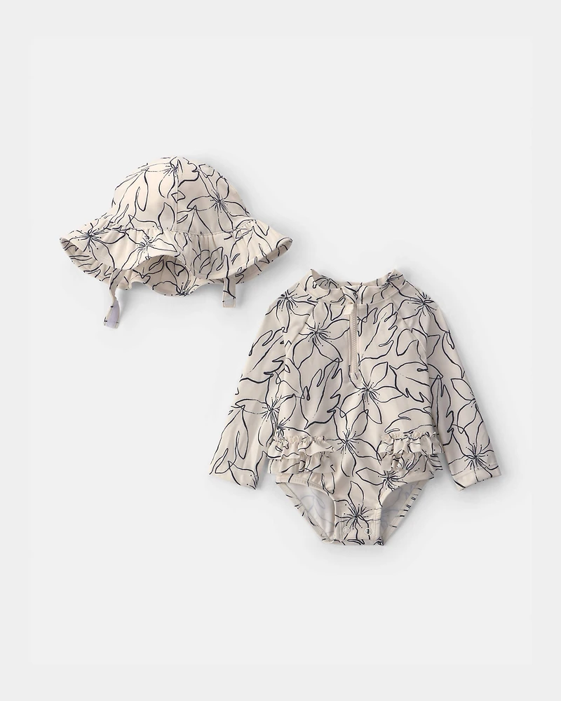 Baby Girl 2-Piece Floral Rashguard Swimsuit & Hat Set - Black/Ivory