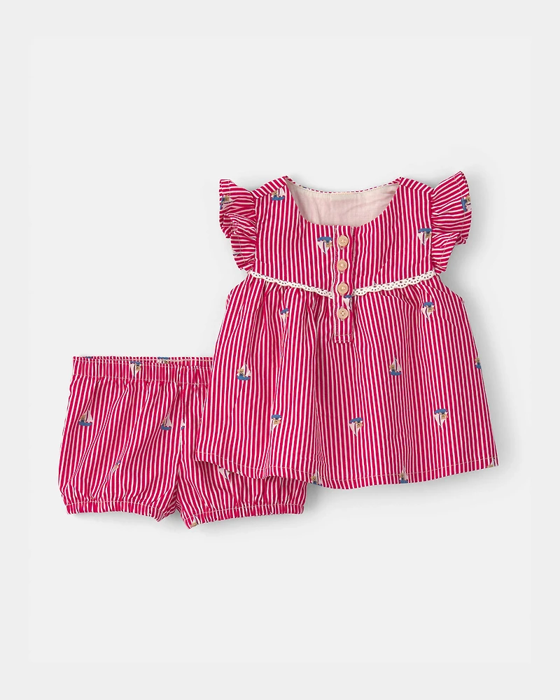 Baby Girl 2-Piece Teddy Bear Sailboat Top & Short Set - Red