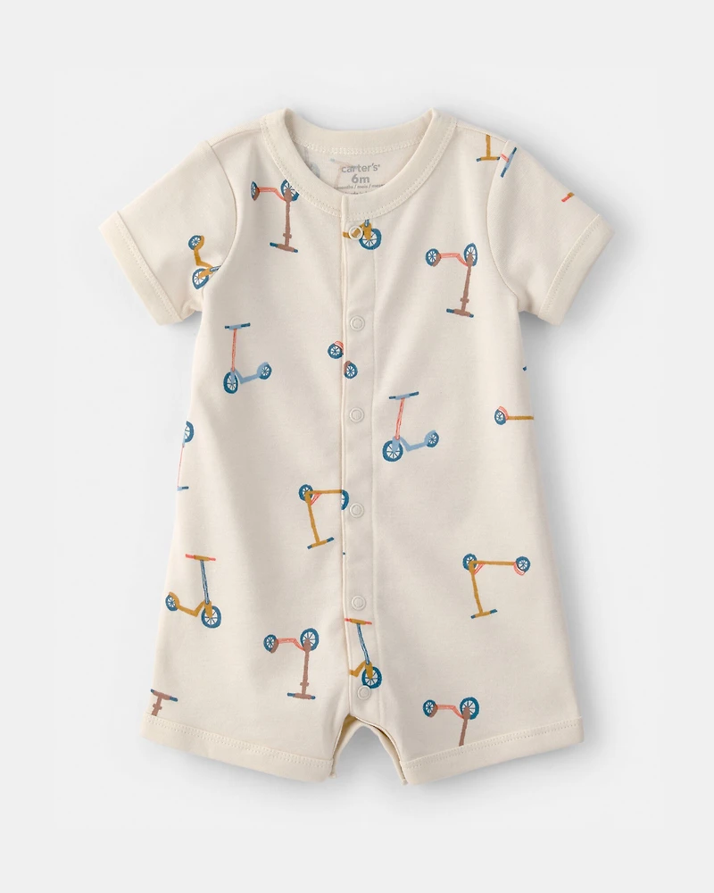 Every day is an adventure in this playful romper, designed for your little explorer. Featuring an allover colorful print of scooters, it adds a dash of fun to casual outings while keeping comfort at the forefront. The soft fabric ensures all-day wearability, while the snap closures make dressing and diaper changes a breeze, perfect for busy parents. Ideal for warmer days, this piece is a must-have for playdates and family outings, blending style with practicality effortlessly.