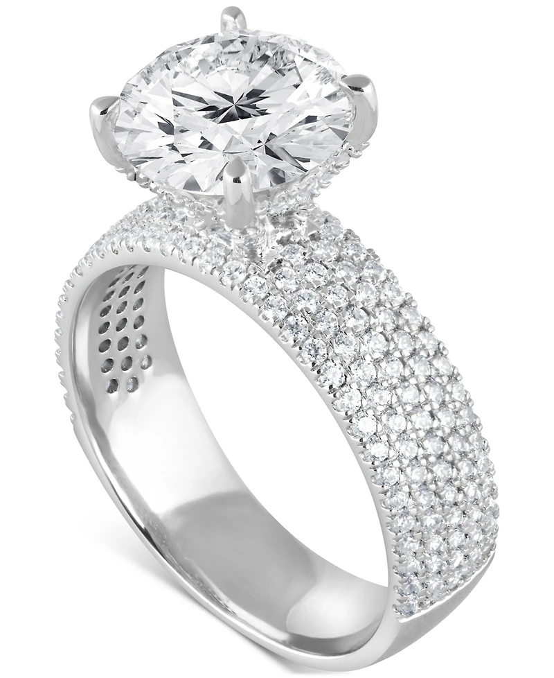 A wide elegant diamond-encrusted shank showcases a raised principal stone (3 ct. t.w.) in this truly magnificent certified lab grown diamond engagement ring from Badgely Mischka