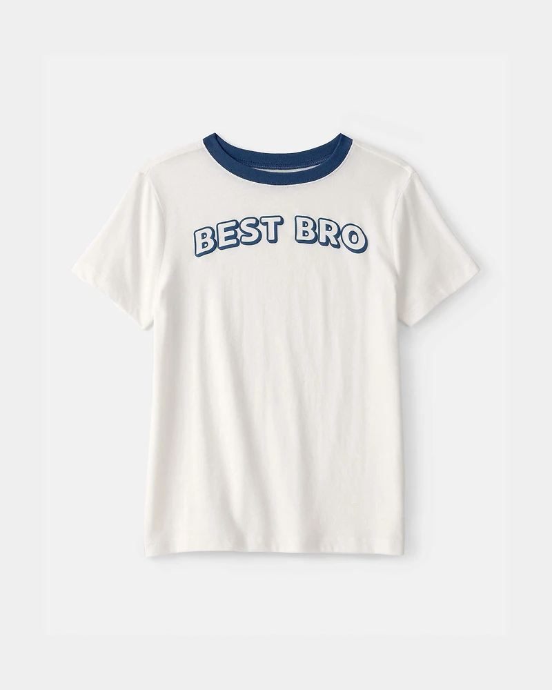 Celebrate his special role with this fun "Best Bro" graphic tee. Made from soft, relaxed-fit jersey fabric, it promises all-day comfort whether he’s at playdates or family outings. The easy-to-wear design ensures quick dressing, making busy mornings a breeze. With a classic ivory base and stylish navy trim, it pairs effortlessly with shorts or jeans for versatile styling. Perfect for any season, this tee combines comfort and fashion, making it a go-to choice for both kids and parents.