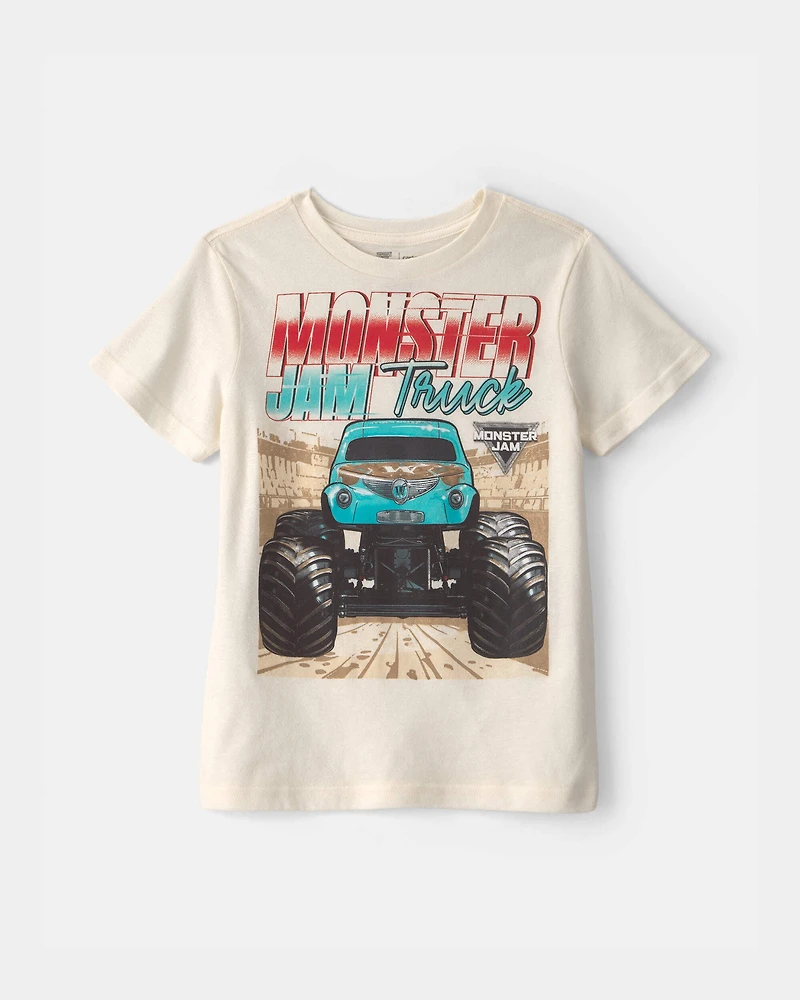 Get ready for adventure with this bold graphic tee featuring a striking Monster Truck design. The short-sleeve cut keeps your little one cool and comfortable, perfect for warm days of play. Made from soft fabric, it ensures all-day wear without fuss. The versatile cream color easily pairs with any outfit, making dressing a breeze. Plus, it’s an official Monster Jam licensed character, perfect for young fans. This tee combines style and comfort, making it a must-have for every active boy's wardrobe.