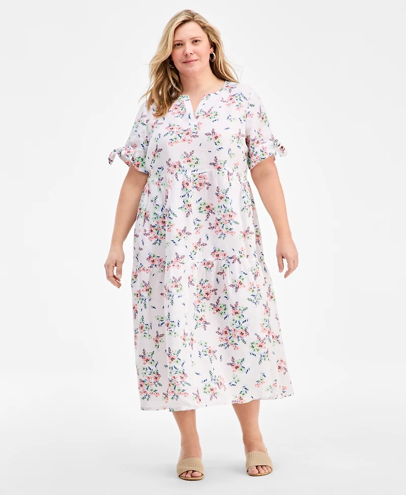 Charter Club Plus Linen Tie-Sleeve Tiered Dress, Macy's Exclusive