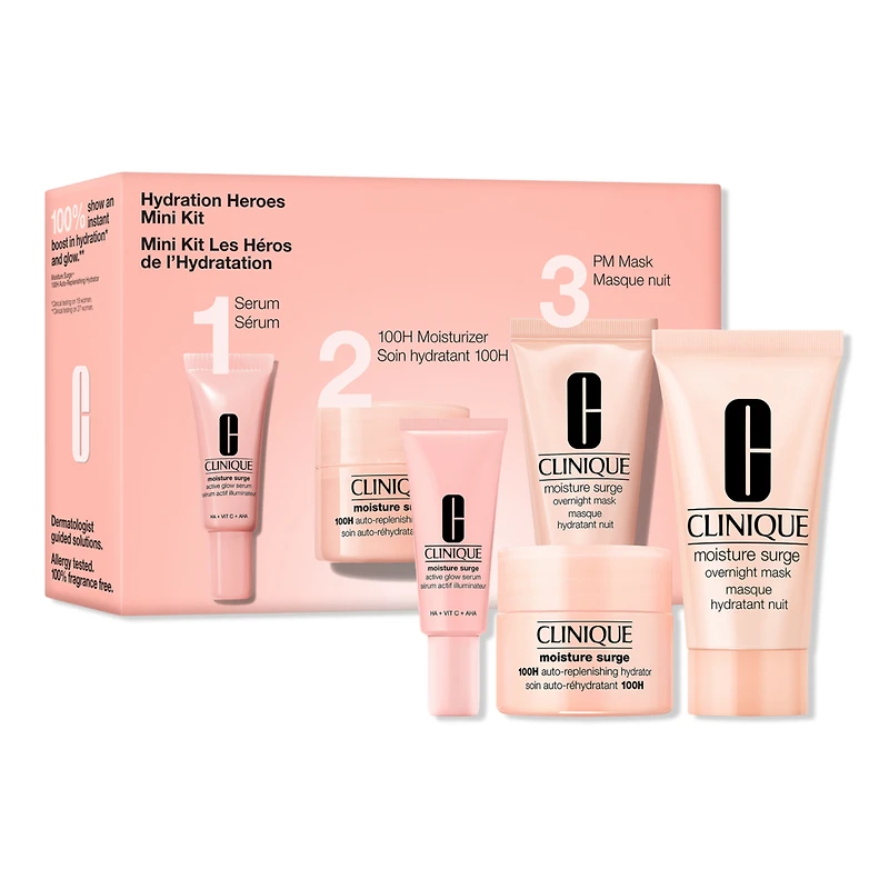 HYDRATION HEROES MINI KIT (MS). Benefits: Skin Type: All. Moisture Surge Active Glow Serum includes 3 powerful ingredients to help exfoliate, hydrate, and brighten, for an instant and continuous glow. Moisture Surge 100H Auto-Replenishing Hydrator moisturizer is an oil-free moisturizer that delivers hydration that soothes in 3 seconds.. Moisture Surge Overnight Mask deeply nourishes while you sleep.. Free of: parabens and phthalates.. Dermatologist tested.. Allergy tested. 100% fragrance free.. Includes: Moisture Surge 100H Auto-Replenishing Hydrator Moisturizer with Hyaluronic Acid, 15ml. Moisture Surge Active Glow Serum with Hyaluronic Acid, 5ml. Moisture Surge Overnight Mask, 30ml. :