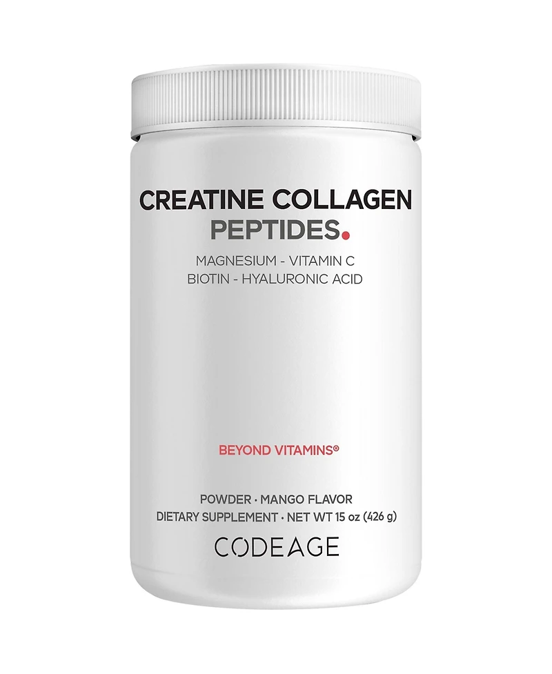 Codeage Creatine Collagen Peptides Mango powder supplement brings together two celebrated ingredients — creatine monohydrate and hydrolyzed marine collagen peptides type I and Iii. This distinctive creatine supplement blend also features magnesium, biotin, hyaluronic acid, and vitamin C in a convenient-to-mix, mango-flavored powder format.