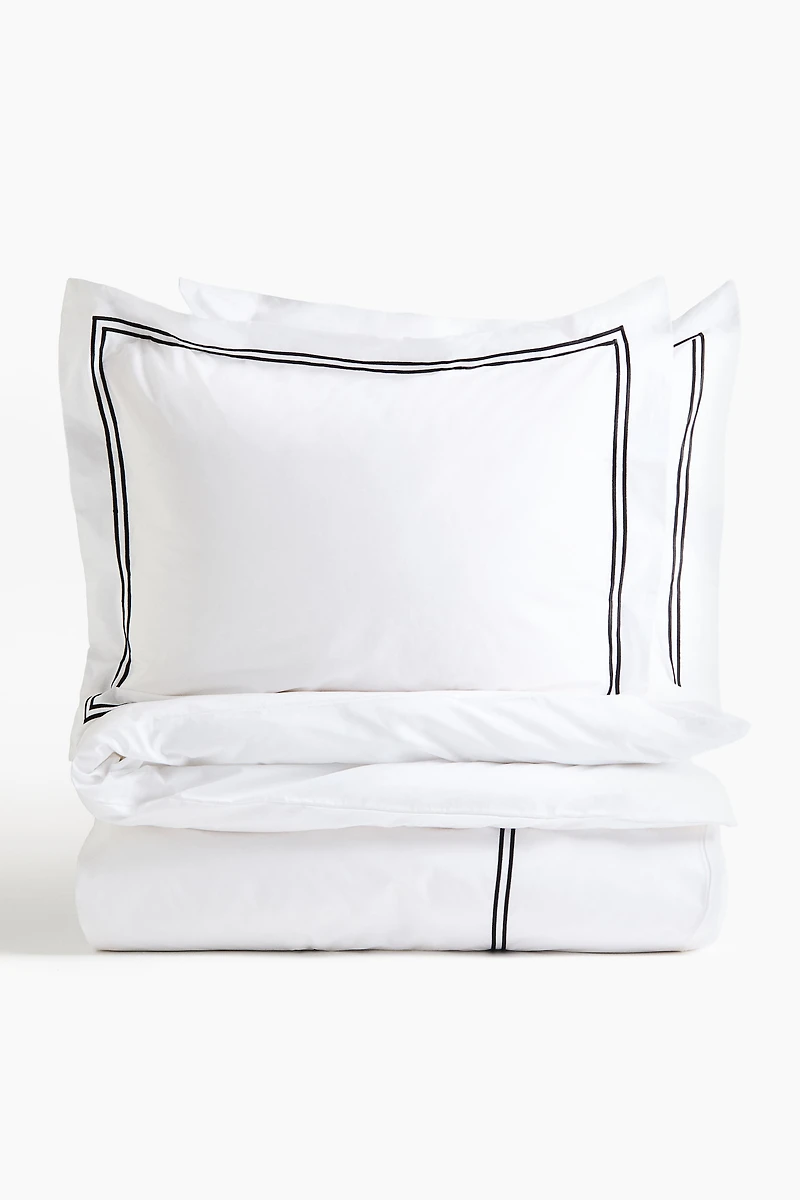 King/queen duvet cover set in densely-woven cotton percale with embroidery. Duvet cover fastens at foot end with buttons. Two pillowcases with envelope opening. Thread count 300.