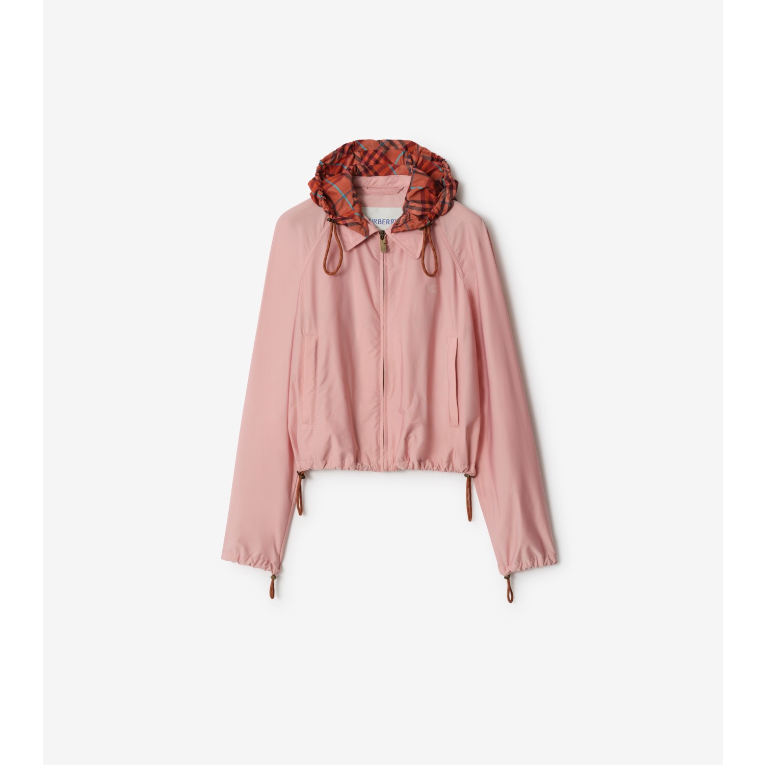 The classic Harrington jacket is reworked in a lightweight stretch nylon twill, with a detachable Burberry Check hood for unpredictable British weather. The cropped silhouette is cut to a relaxed fit with raglan sleeves for a softly curved shoulder. A subtle Equestrian Knight Design is printed on the chest. Zip closure Detachable drawcord hood Side zip pockets Drawcord hem and cuffs Printed Equestrian Knight Design at chest Comes with a garment bag