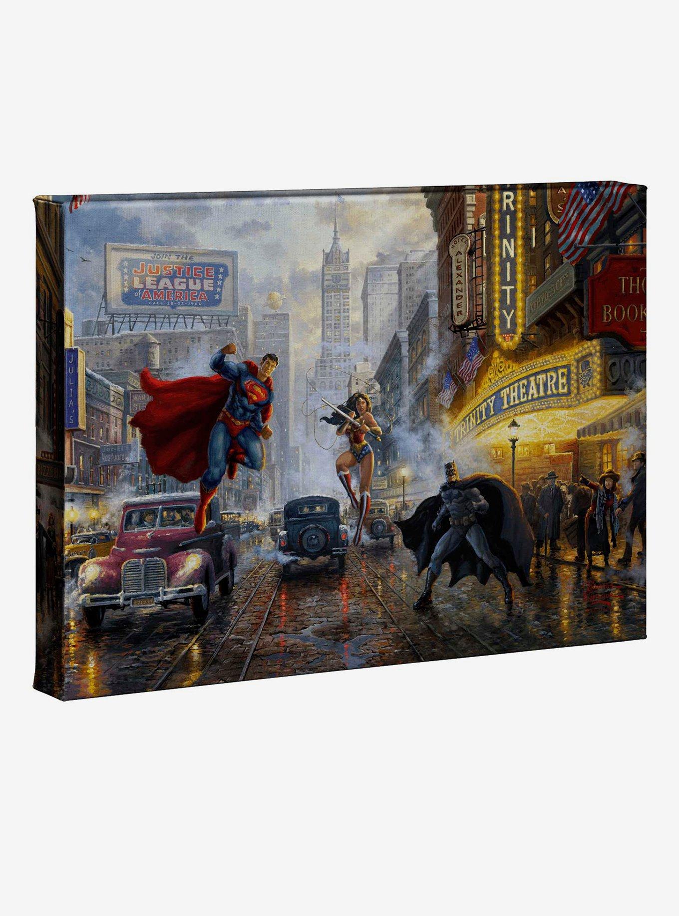 In this scene, the trio is preparing to fight an enemy in a place that evokes iconic memories from each hero?s personal history. From arch enemies and beloved friends to important dates, we invite you to explore the hidden salutes we have included in this painting. Thomas Kinkade Studios Gallery Wraps are perfect for any space. Each wrap is crafted with our premium canvas reproduction techniques and hand wrapped around a deep, hardwood stretcher bar. Hung as an ensemble or by itself, this frameless presentation gives you a versatile way to display art in your home. Certificate of authenticity included.  Item cannot be shipped to P.O. Boxes