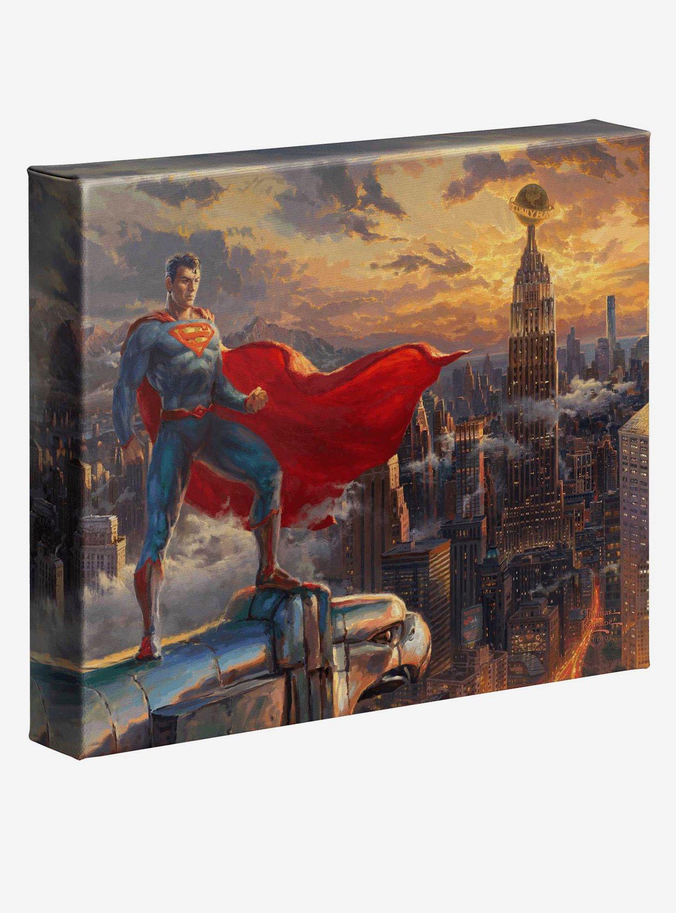 Thomas Kinkade Studios Gallery Wraps are perfect for any space. Each wrap is crafted with premium canvas reproduction techniques and hand wrapped around a deep, hardwood stretcher bar. Hung as an ensemble or by itself, this frameless presentation gives you a versatile way to display art in your home. Certificate of authenticity included. Under the ever-vigilant protection of Superman, Metropolis is a gleaming urban center, a melting pot of peoples and cultures, and an iconic city that is a beacon of hope. Coined as The City of Tomorrow it is a global center for commerce, industry and culture making it an irresistible target for common criminals, Super-Villains and otherworldly aliens alike. Superman Protector of Metropolis is a symbol of American opportunity and values. One of the hallmarks of America is that people can reach their full potential when allowed the freedom to do so. Superman embodies this ideal, since as a superhuman he chooses to help and protect rather than conquer and enslave. Join us as we peer into this Kinkadian scene, set atop of DC Comics most legendary city. At the break of dawn, the Man Of Steel is poised and ready to protect his adopted home town and planet from anything and anyone that threatens its safety. Item cannot be shipped to P.O. Boxes