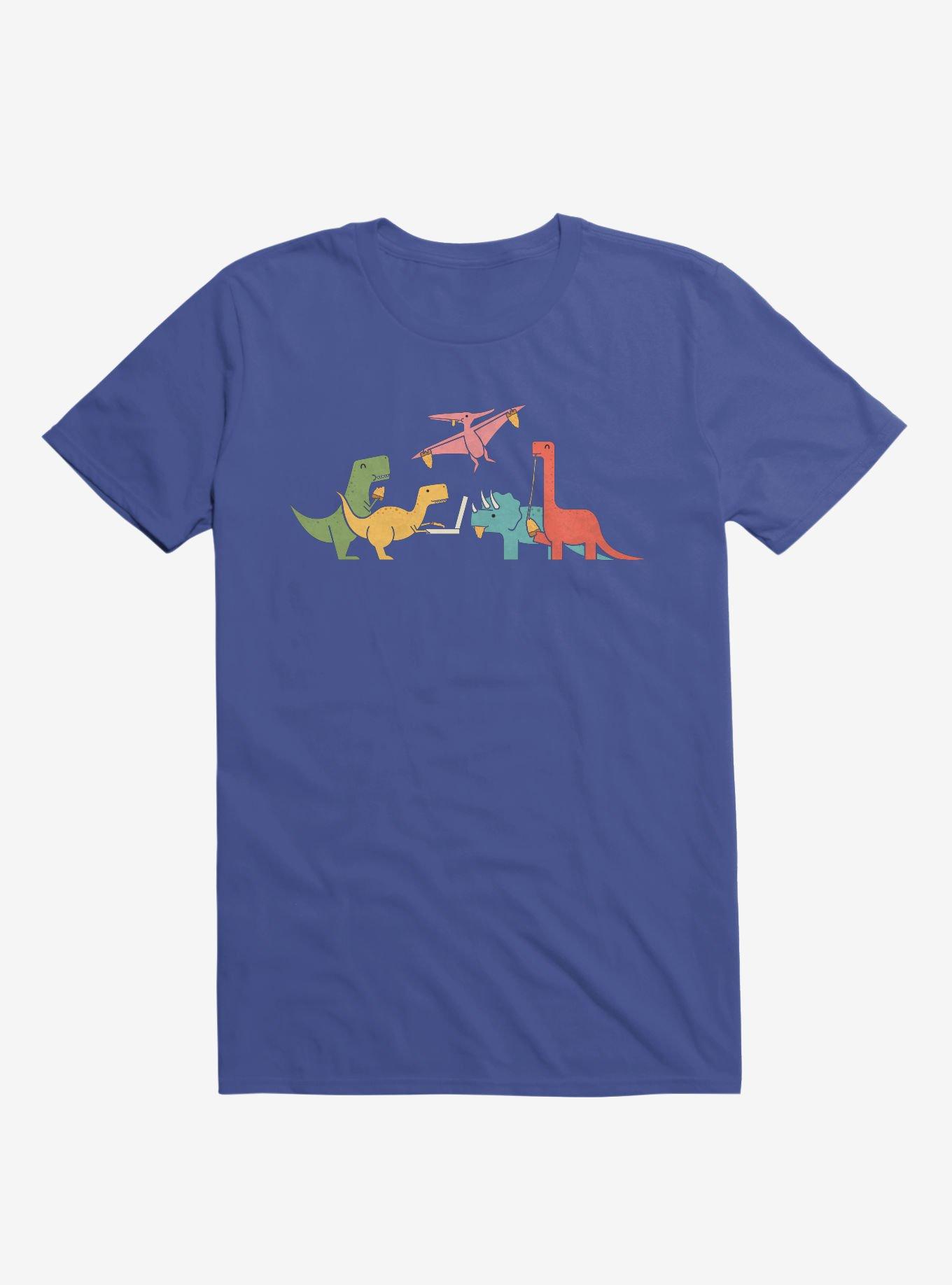 NBD, just a bunch of dinosaurs eating pizza on this lightweight royal blue tee. You shouldn't be surprised or anything. Everybody likes pizza. Officially licensed art from handsoffmydinosaur.