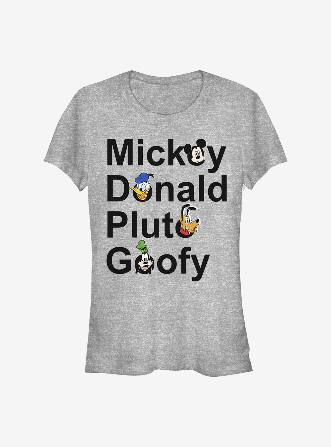 Let's hear it for the boys! Mickey, Donald, Pluto and Goofy appear on this fitted Disney tee in a stacked name design.