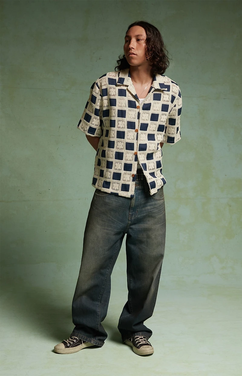The Checkered Yucca Camp Shirt from Field of Study by Pacsun channels vintage-inspired cool with a modern edge. This relaxed-fit shirt features a bold checkerboard print made from a mixed crochet fabric for breathability, a camp collar, short sleeves, and a classic button-down front for an effortlessly elevated look.