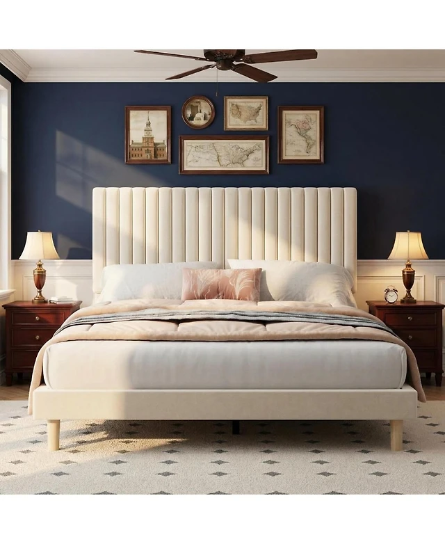gaomon King Size Velvet Platform Bed Frame with Vertical Channel Tufted Adjustable Headboard