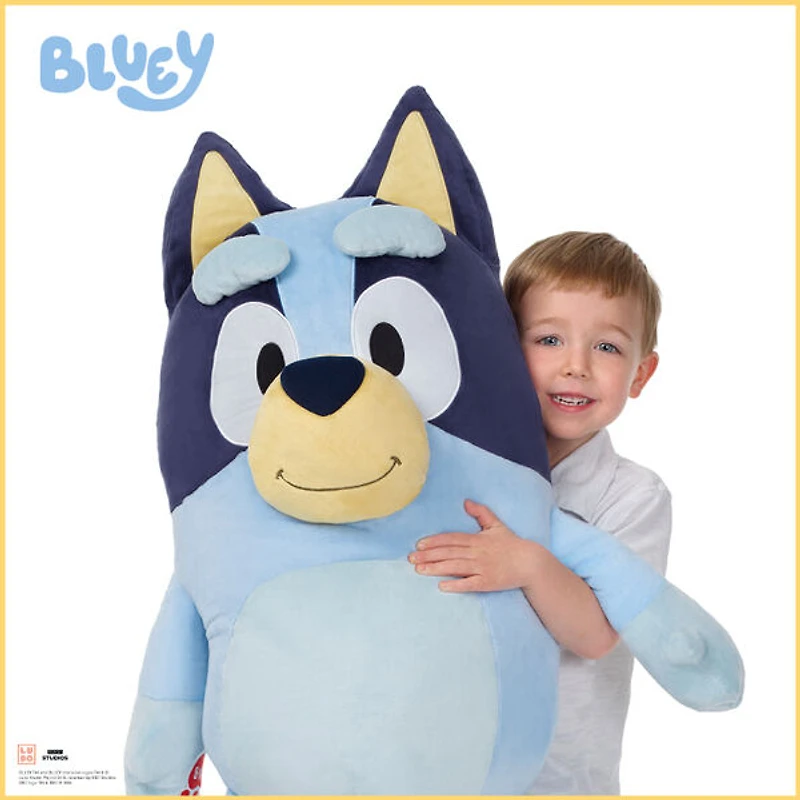 Experience the biggest Bluey adventures with this GIANT Bluey plush! This endlessly curious blue heeler puppy loves to laugh, have fun and play games with her family. Her extra large size makes her the ultimate addition to any Bluey fan's collection. She's the perfect friend for cuddling up at home and watching your favorite show together!