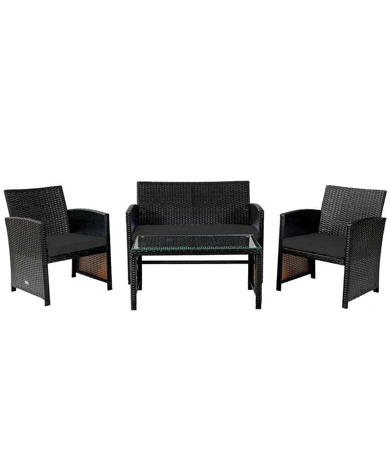 Build a complete outdoor conversation area with this 4-piece rattan set that brings together a loveseat, two single chairs, and a tempered glass coffee table. The mixed brown rattan construction pairs with contrasting black cushions for a sophisticated look that suits modern and traditional patio settings alike. Each piece stands 31 inches tall for consistent visual harmony, while the 35-inch coffee table provides a generous central surface for entertaining.