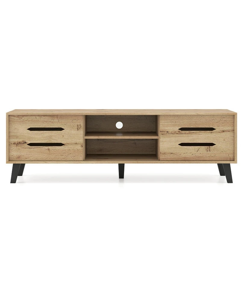 Channeling timeless mid-century appeal, this 59 in Tv stand features two hollow-out sliding doors that glide smoothly to reveal side cabinet contents. The 150 lb capacity tabletop accommodates TVs up to 65 in, while two open middle shelves host streaming devices at eye level. A built-in cable hole routes cords behind the unit, and five sturdy legs with 5.5 in clearance allow robot vacuums access.