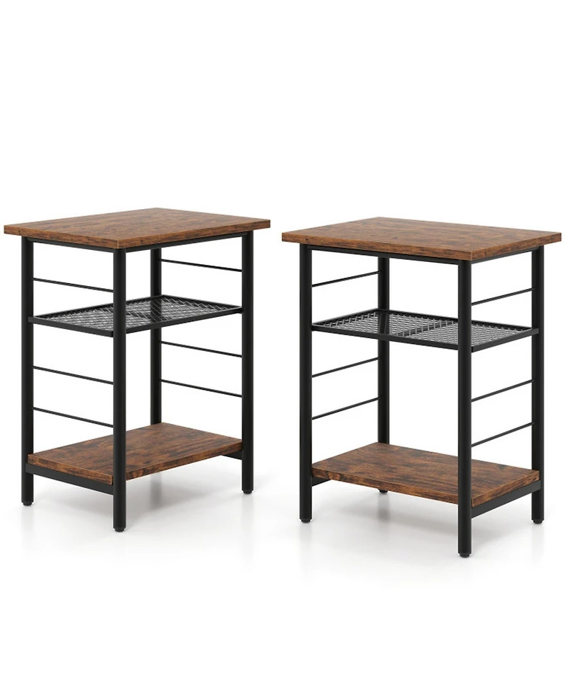 Gouun Set of 2 Industrial 3-Tier End Tables with Adjustable Mesh Shelves