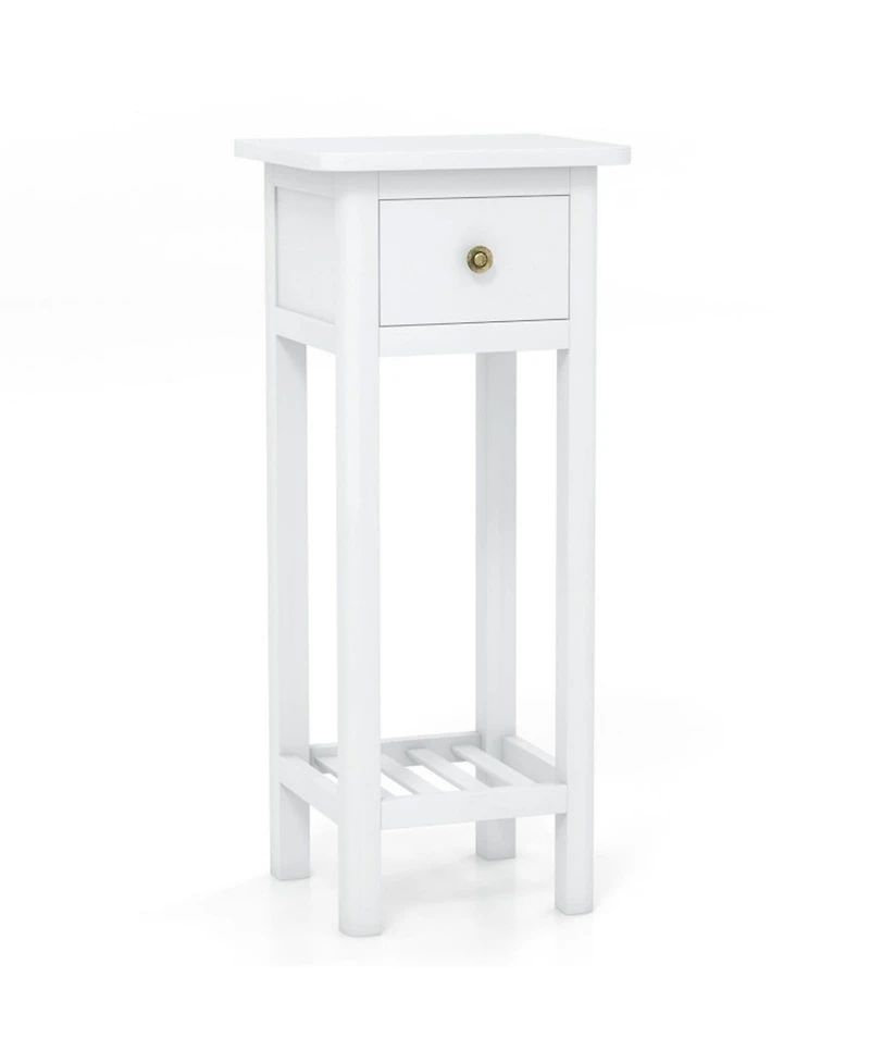 Bringing vintage charm to compact spaces, this slim nightstand features a robust acacia wood frame that resists warping over time. A pull-out drawer conceals essentials while the open lower shelf keeps books within reach. At just 13.5 in. wide and 31.5 in. tall, it fits beside any bed without overwhelming the room. Rounded edges ensure a family-friendly profile, and a wall-securing bracket adds stability.