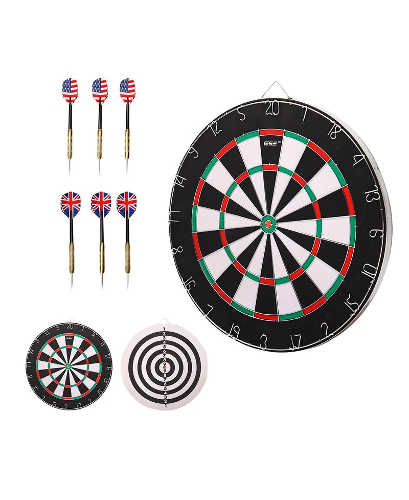 The 18"" 2-in-1 flocking dartboard game set includes a dartboard made from high density and high-visibility flocking, 6 of 17 g steel tip darts and all of game instructions. The dartboard has 2 sides: allowing you to enjoy traditional dart games and the target bullseye games, measuring 18"" in diameter and 1"" in thickness, easily hung anywhere with a hook design, thicker and more durable, non-waterproof. You can easily hang the dartboard and play anywhere, like a game room, pub bar, garage, porch area, patio, office, even campground.