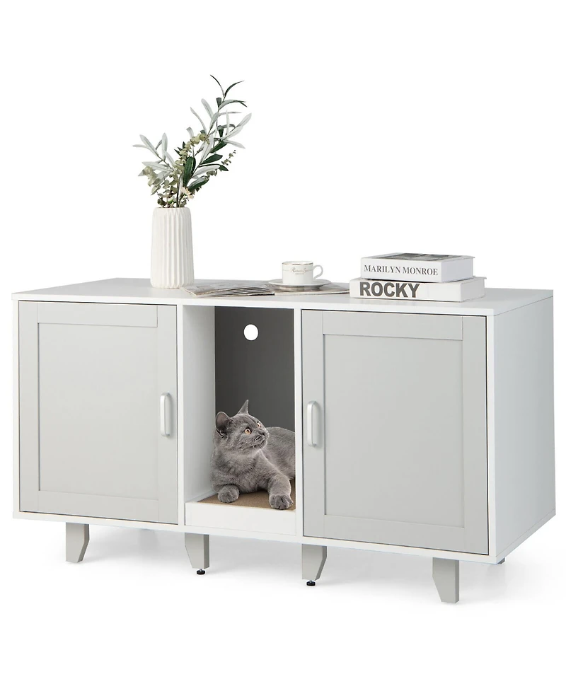 Provide a Comfortable Toileting Experience for Your Lovely Kitten!Our cat litter box enclosure measures 47.5'' x 20.5'' x 25.5'' (L x W x H) and each compartment measures 16'' x 20'' x 20'' (L x W x H),which can accommodate most cat litter boxes (Notice: Please measure the size of your cat litter box before purchase). With the wide tabletop,the cat furniture can also be used as a Tv stand that can hold Tv screens up to 50''. With 2 individual compartments,this hidden cat washroom is great for safeguarding your cats' privacy,allowing them to unleash their natural instincts.Features:Can be used as a cat litter box enclosure,side table,TV stand,coffee table,etcThe spacious tabletop can be used for putting TVs,decors,cat supplies,etc Provide privacy and save you from the trouble of scattered litter and offending smells