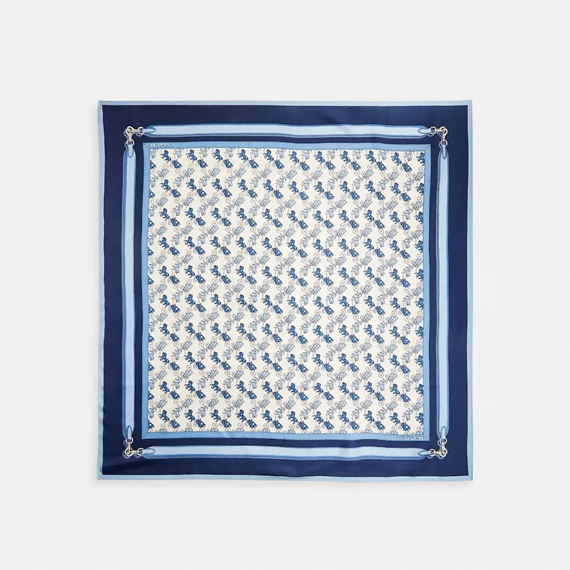 A celebration of Coach heritage, this square scarf features our iconic Horse and Carriage motif bordered by our interchangeable leather bag straps print. Crafted of lightweight silk, wrap it around your neck or throw it over your shoulders for a pop of color.