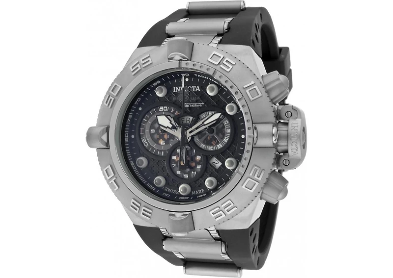 Stainless steel case with a black polyurethane rubber strap with silver-tone inserts. Uni-directional rotating stainless steel bezel. Black dial with silver-tone hands and index hour markers. Minute markers. Tachymeter around the outer rim. Dial Type: Analog. Luminescent hands and markers. Date display between 4 and 5 o'clock position. Chronograph - three sub-dials displaying: 60 second, 30 minute and 1/10th of a second. Quartz movement. Scratch resistant flame fusion crystal. Screw down crown. Solid case back. Case diameter: 50 mm. Case thickness: 20 mm. Round case shape. Band width: 32mm. Band length: 10 inches. Tang clasp. Water resistant at 500 meters / 1650 feet. Functions: chronograph, date, day, hour, minute, second. Sport watch style. Watch label: Swiss Made. Invicta Subaqua Noma Iv Swiss Chronograph Black Dial Stainless Steel Men's Watch 1388.