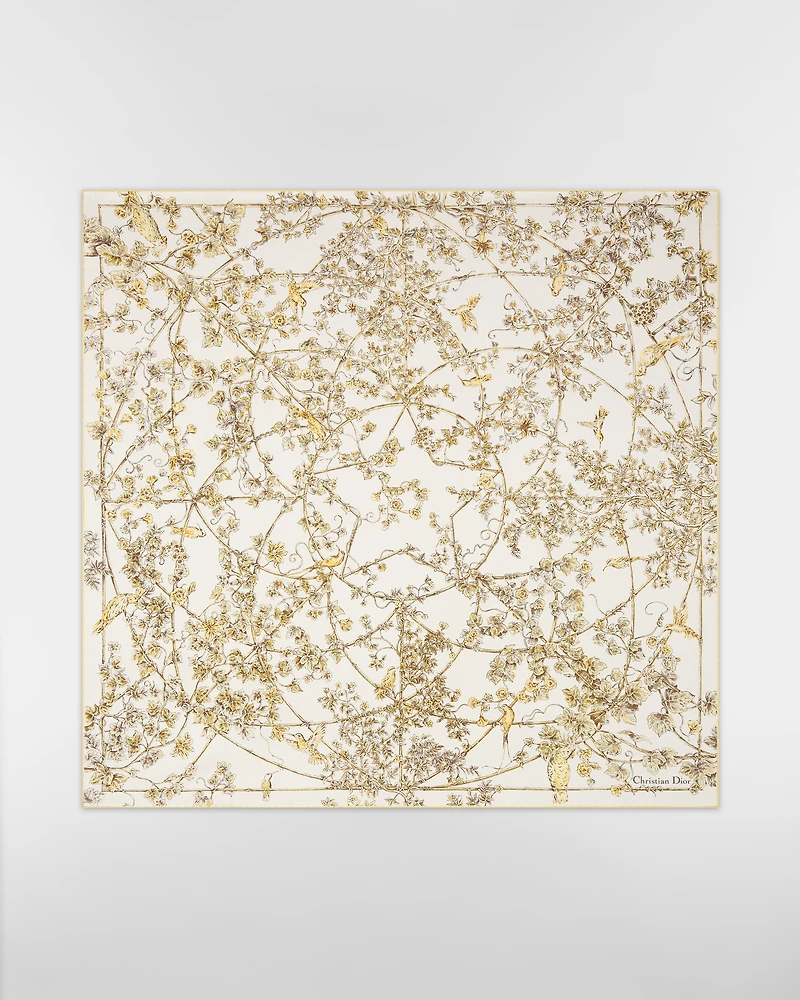 The square scarf showcases the Jardin D-Étoile print, inspired by the fresco in the Villa Medici's Room of Birds and incorporating the House's lucky star as well as luxurious vegetation inhabited by hummingbirds and parakeets. Crafted in white and gold-tone silk twill, the double-sided style with hand-rolled edges is enhanced by the Christian Dior signature. The square scarf can be tied at the neck or head to complete a Dior look.