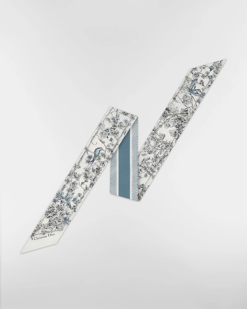 The white and gold-tone silk twill Mitzah scarf showcases the Jardin D-Étoile print, inspired by the fresco in the Villa Medici's Room of Birds and incorporating luxurious vegetation inhabited by hummingbirds and parakeets. The timeless elongated shape with pointed ends is enhanced by a contrasting gold-tone jacquard band with the Christian Dior signature. The Mitzah will lend the finishing touch to any modern outfit and may be tied around the neck, at the wrist or on a bag.