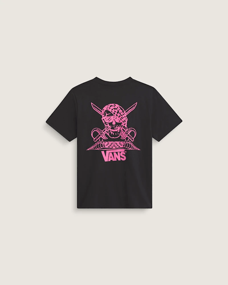 This classic short sleeve T-shirt features a striking graphic on the back, blending Vans' iconic logo with a distinctive skull design. The front keeps it simple with a small logo hit, creating a versatile piece that's ready for whatever your day brings. Made from soft cotton jersey, it offers all-day comfort in a timeless silhouette that pairs easily with your favorite jeans or shorts.\