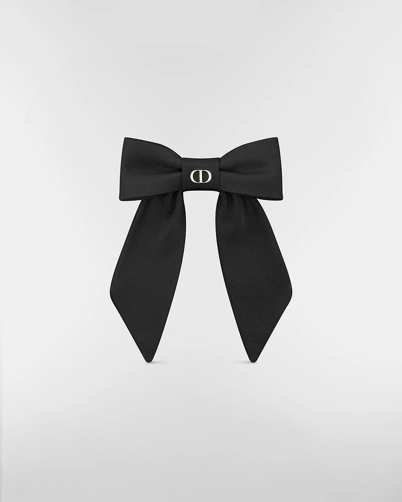 The Dior Twist bow is revisited with a large design imbued with House codes of refinement. A pillar House symbol, the bow is redesigned in black grosgrain-effect technical fabric and delicately adorned with a pale gold-finish CD signature in the center. The barrette will enhance any hairstyle with a couture touch.